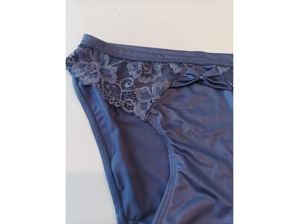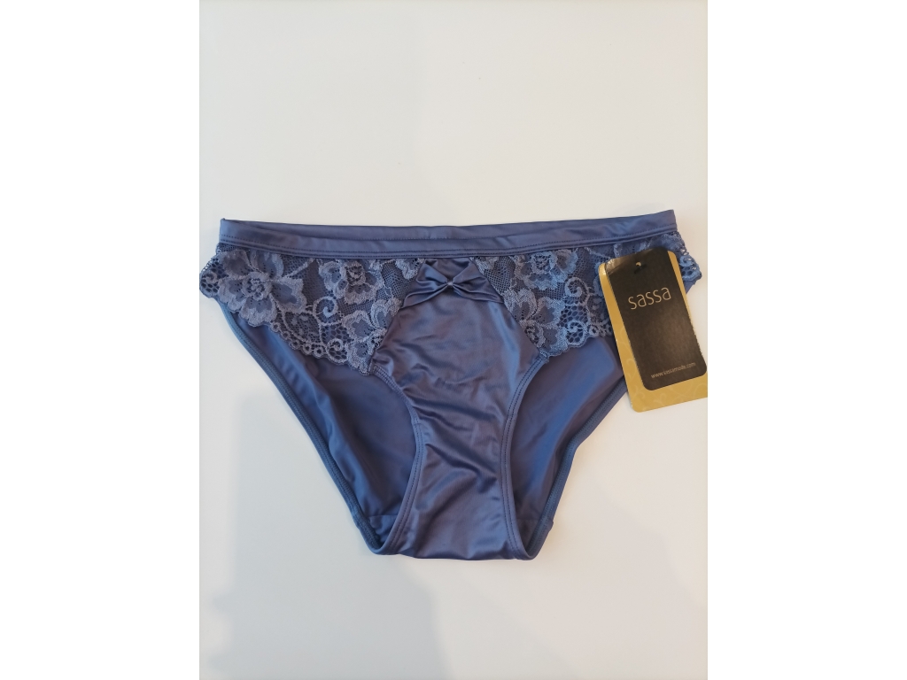 Krásne dámske modré nohavičky klasického slipového strihu. Predná strana je kombinácia jemnej čipky a lesklého mikrovlákna v stredovej časti. Tá je veľmi elegantne ozdobená všitou mašličkou z rovnakého materiálu. V páse je jemný prúžok tiež z mikrovlákna. Zadoček nohavičiek je celý z lesklého mikrovlákna. Bavlnený klin je samozrejmosťou. Nohavičky ladia s podprsenkou SASSA 24442 , tiež v ponuke u nás.