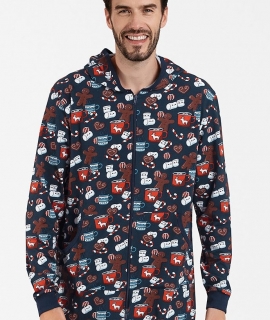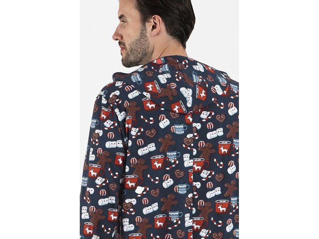 Originálny darček pre muža! Pánsky pyžamový overal je skvelou voľbou pre tých mužov, ktorí sa neboja vyzerať originálne! Takýto outfit znamená pohodlie, voľnosť a... úsmev na tvári každého! Zdobená fantastickým vzorom roztomilých koláčikov je ako stvorená na leňošivé večery doma. Prírodný materiál bude príjemný k pokožke a voľný strih, celoprepínací zips a kapucňa poskytnú voľnosť a pohodlie. Bavlnený pánsky oblek na spanie je zakončený manžetami na rukávoch a nohách, čo zvyšuje komfort nosenia.