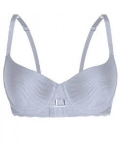 Vystužená dámska podprsenka v tmavomodrej farbe s bielymi tenučkými pásikmi. Medz košíčkami ozdoba v tvare striebornej spony.