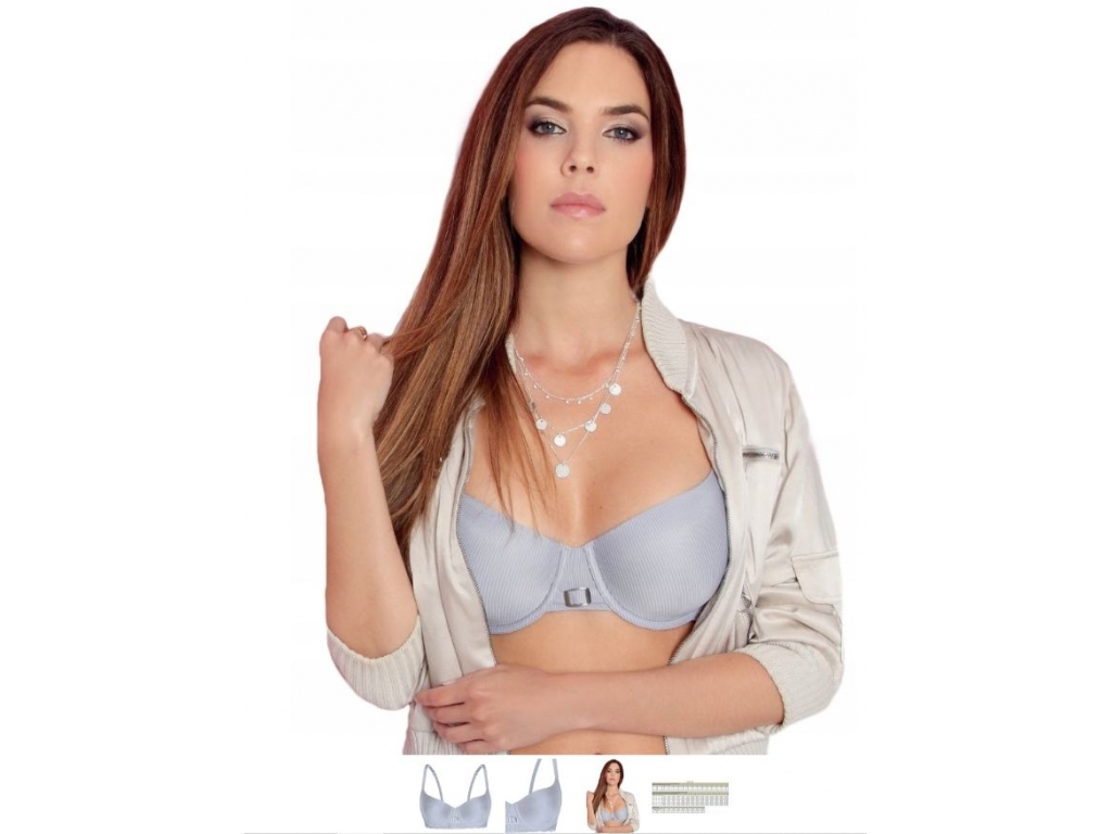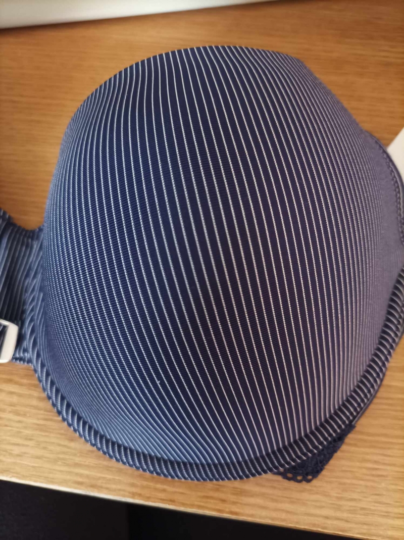 Vystužená dámska podprsenka v tmavomodrej farbe s bielymi tenučkými pásikmi. Medz košíčkami ozdoba v tvare striebornej spony.